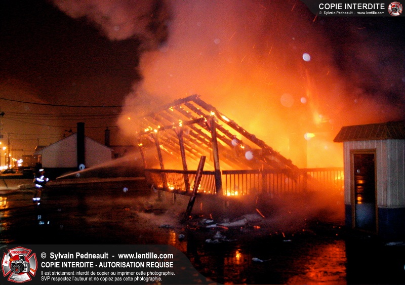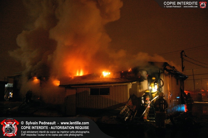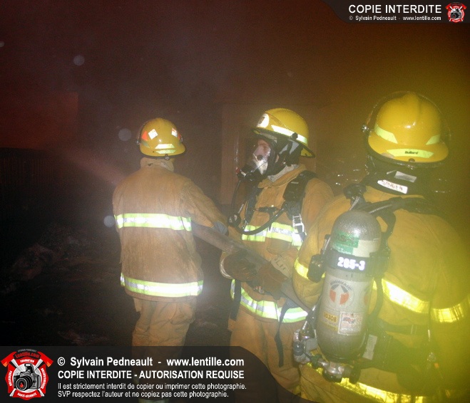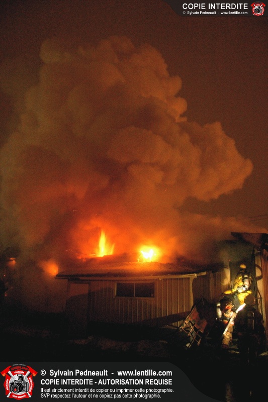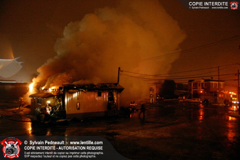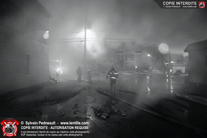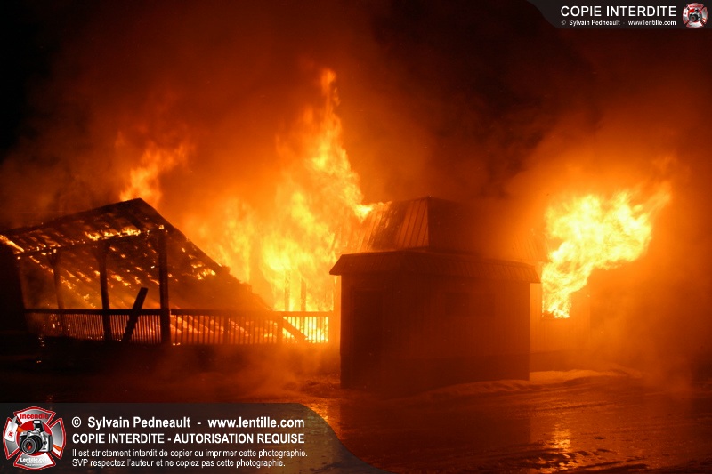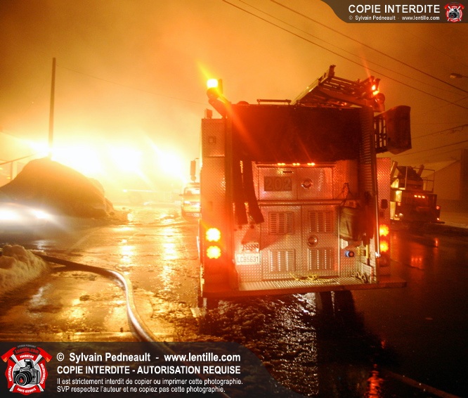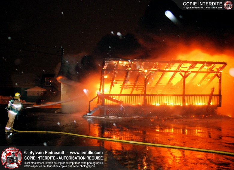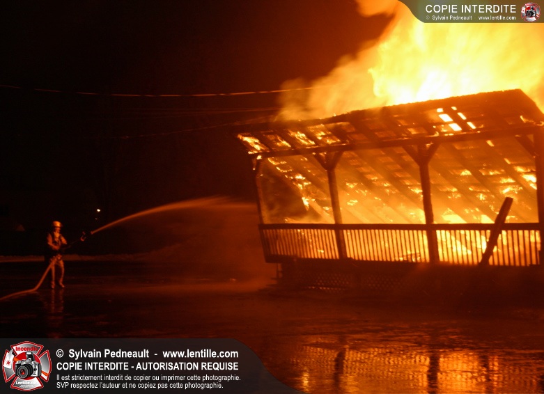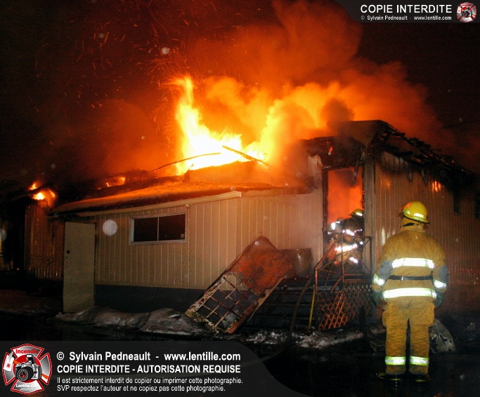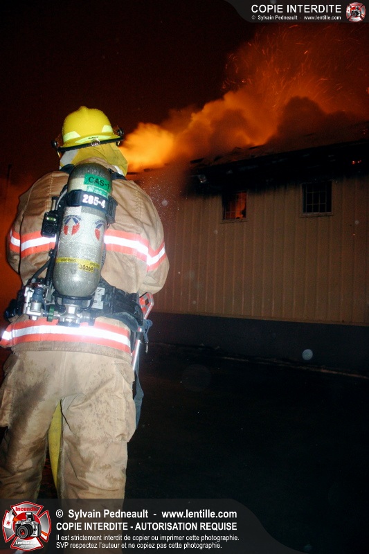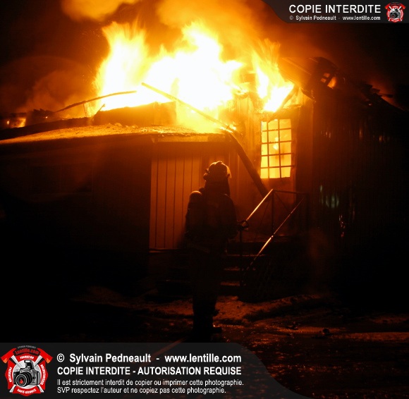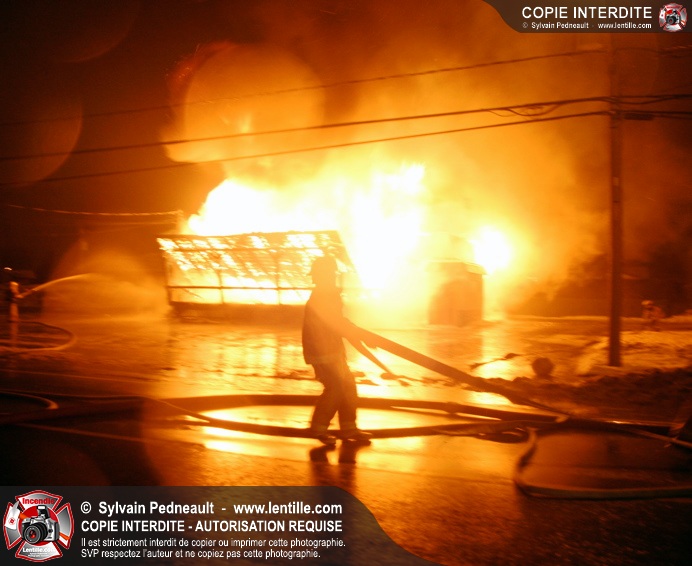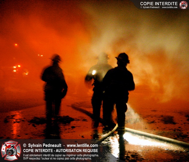 L'unité 205, encore à bonne distance du brasier, donne un 10-07 à la vue des flammes de plusieurs mètres de haut. Étant donné la perte évidente du bâtiment et l'absence de risque de propagation collatérale, une première alarme suffit à combattre le sinistre d'origine suspecte.