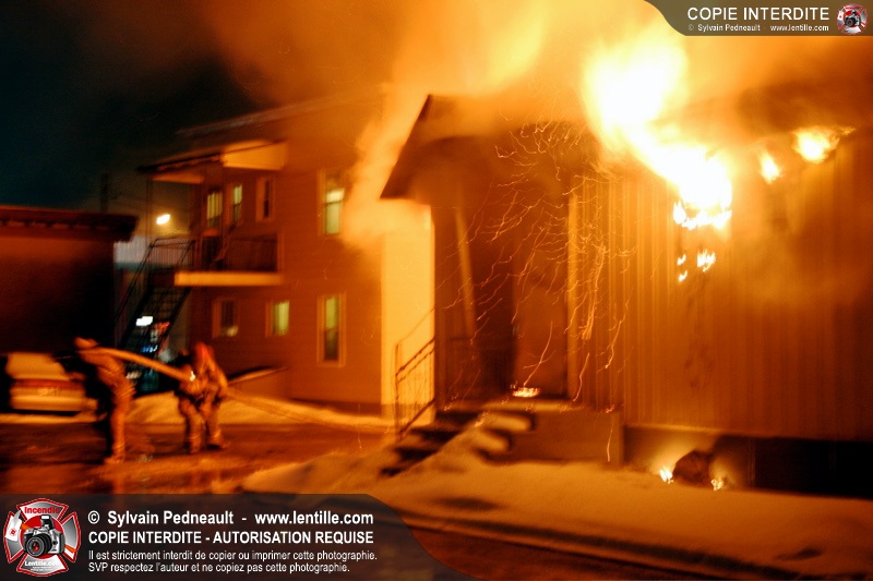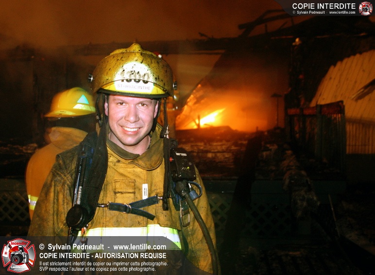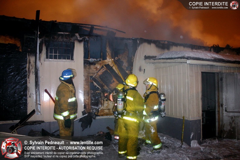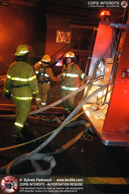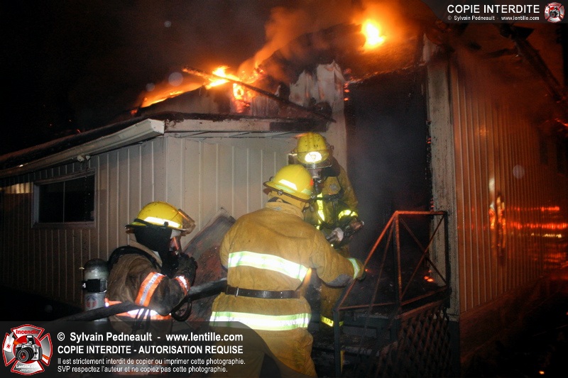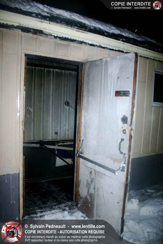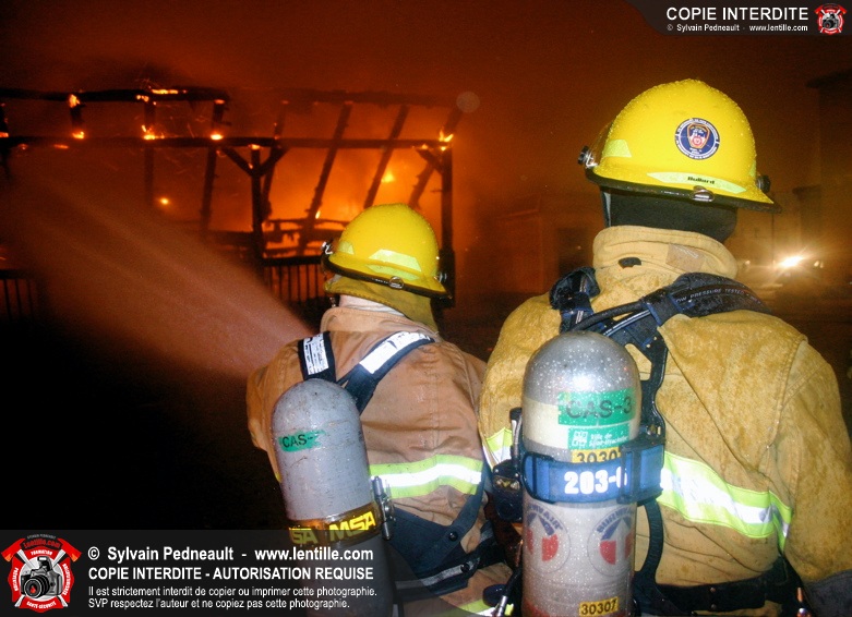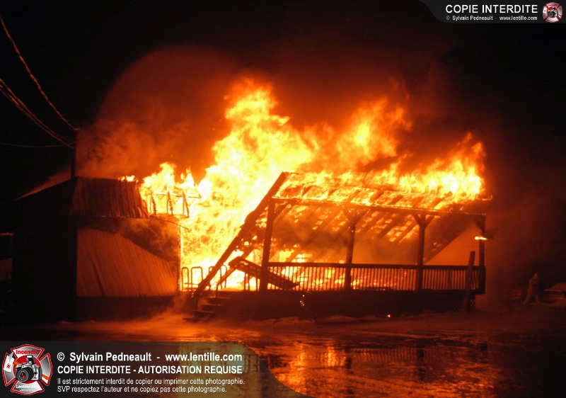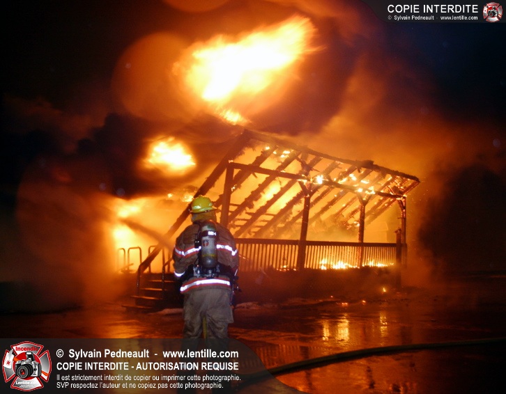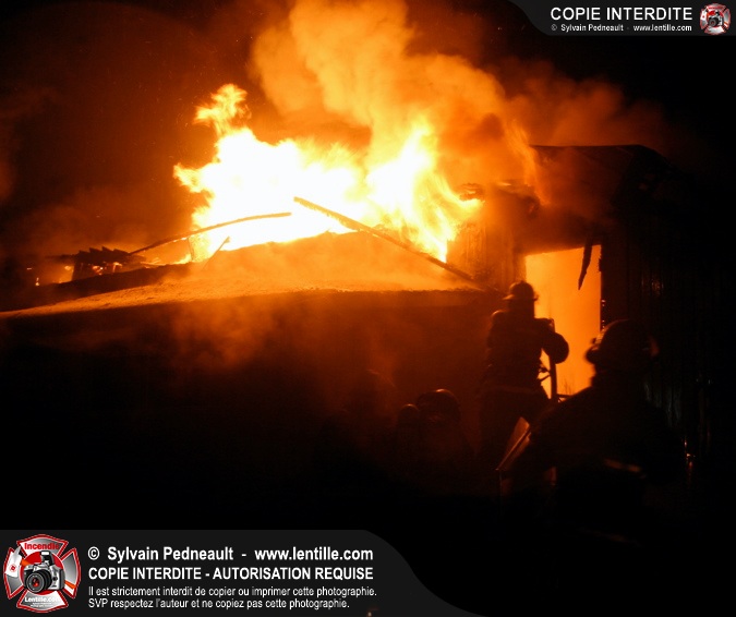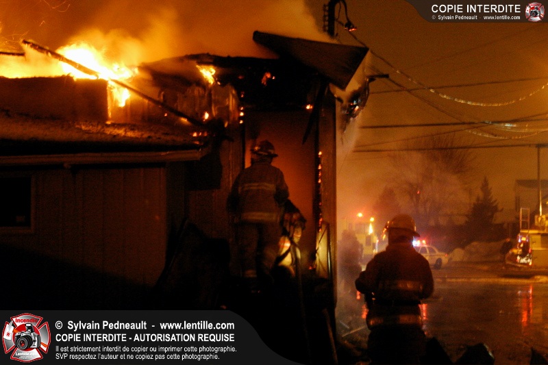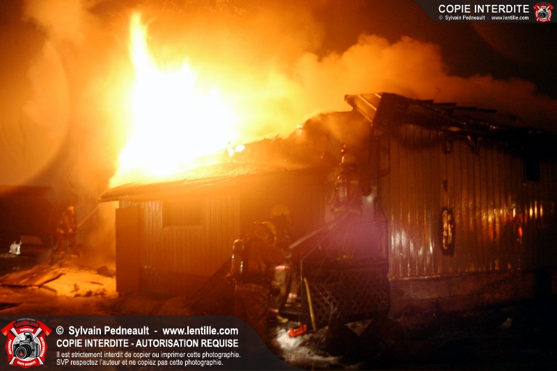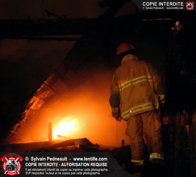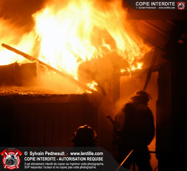 L'unité 205, encore à bonne distance du brasier, donne un 10-07 à la vue des flammes de plusieurs mètres de haut. Étant donné la perte évidente du bâtiment et l'absence de risque de propagation collatérale, une première alarme suffit à combattre le sinistre d'origine suspecte.