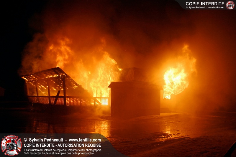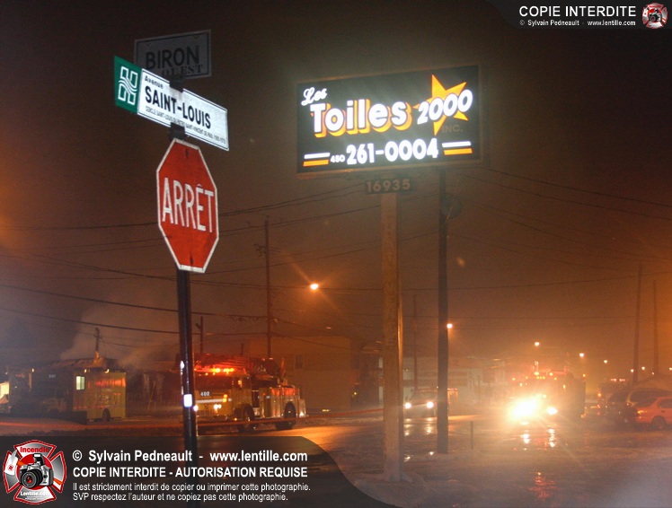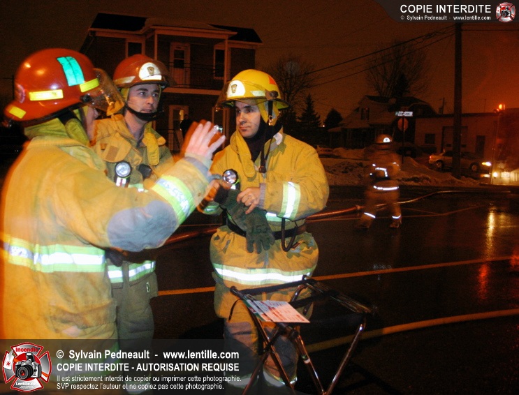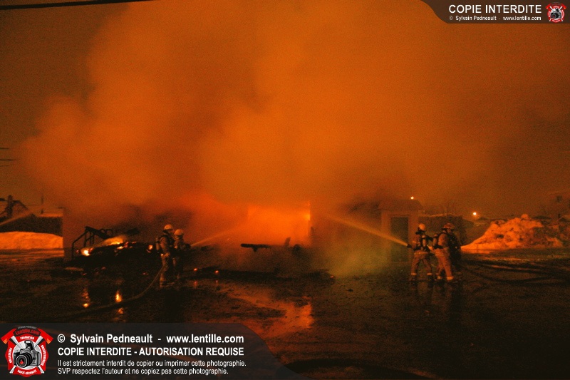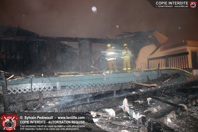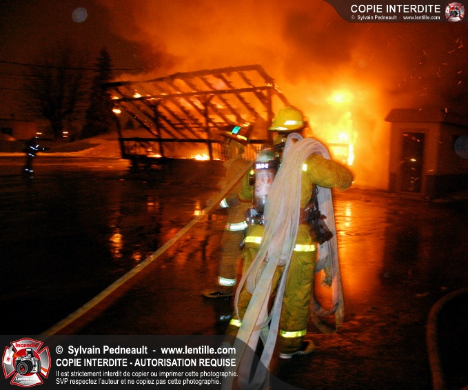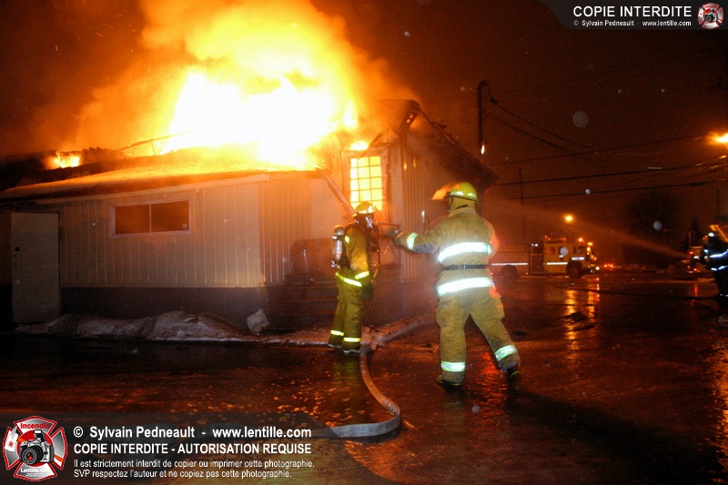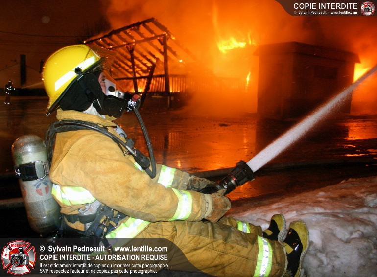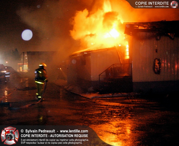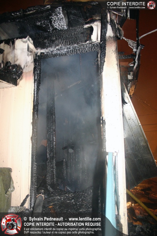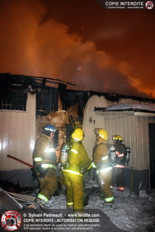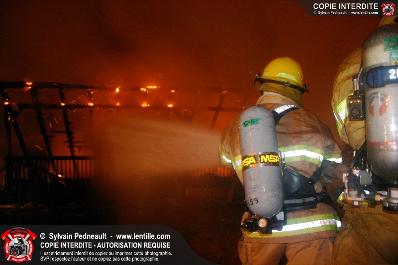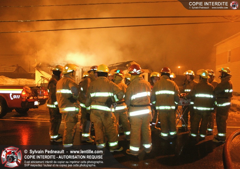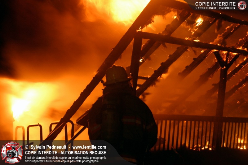 L'unité 205, encore à bonne distance du brasier, donne un 10-07 à la vue des flammes de plusieurs mètres de haut. Étant donné la perte évidente du bâtiment et l'absence de risque de propagation collatérale, une première alarme suffit à combattre le sinistre d'origine suspecte.