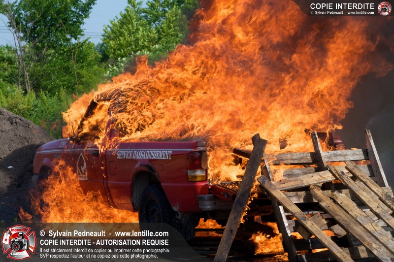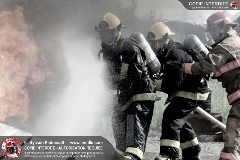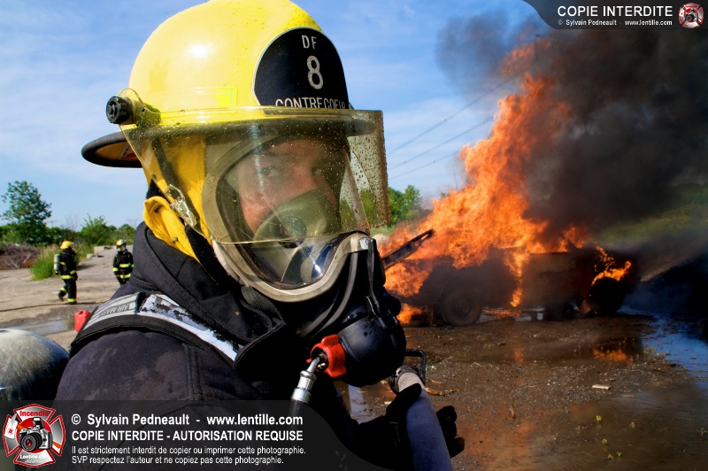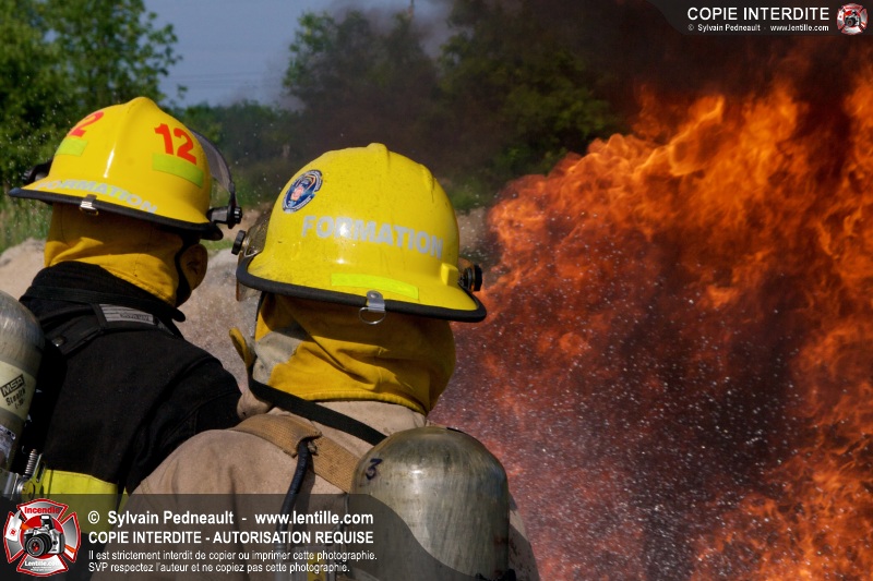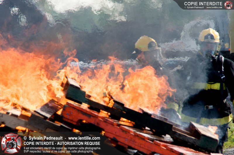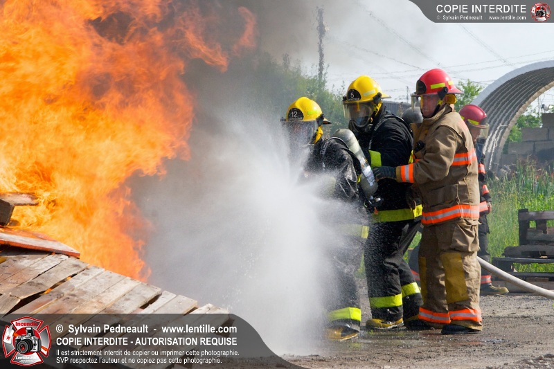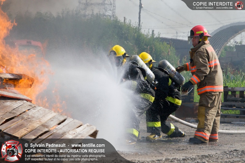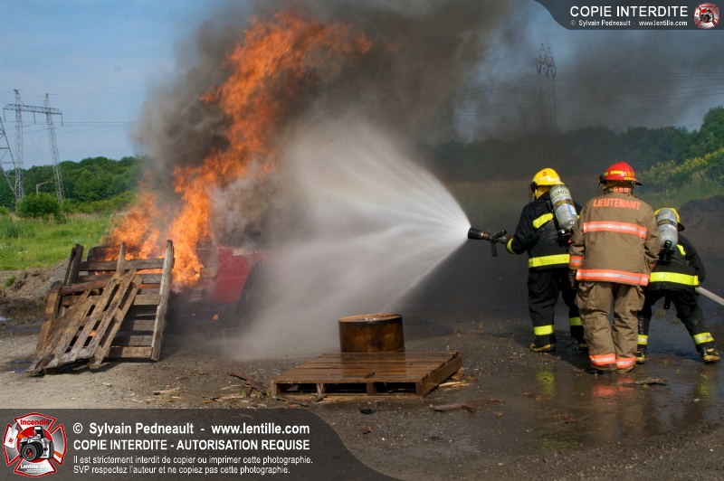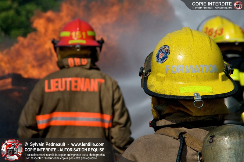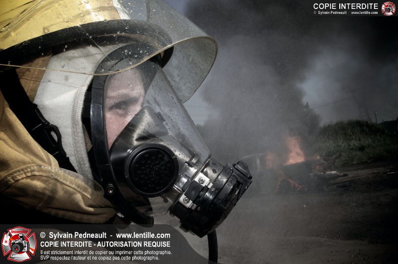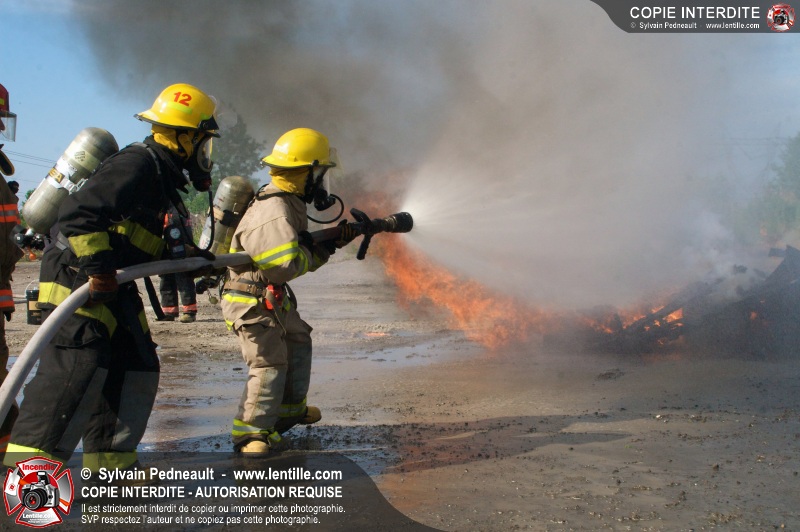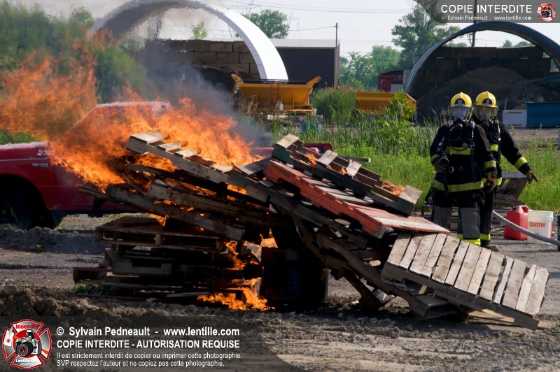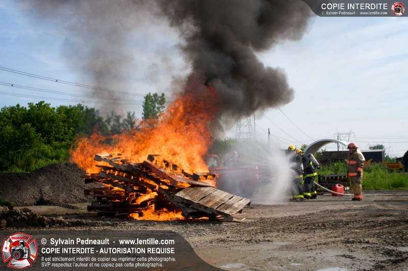 Des pompiers en formation à Contrecoeur ont participé à une pratique d'incendie. Des palettes de bois et un véhicule ont été utilisés pour permettre aux étudiants de pratiquer différentes manoeuvres d'intervention.